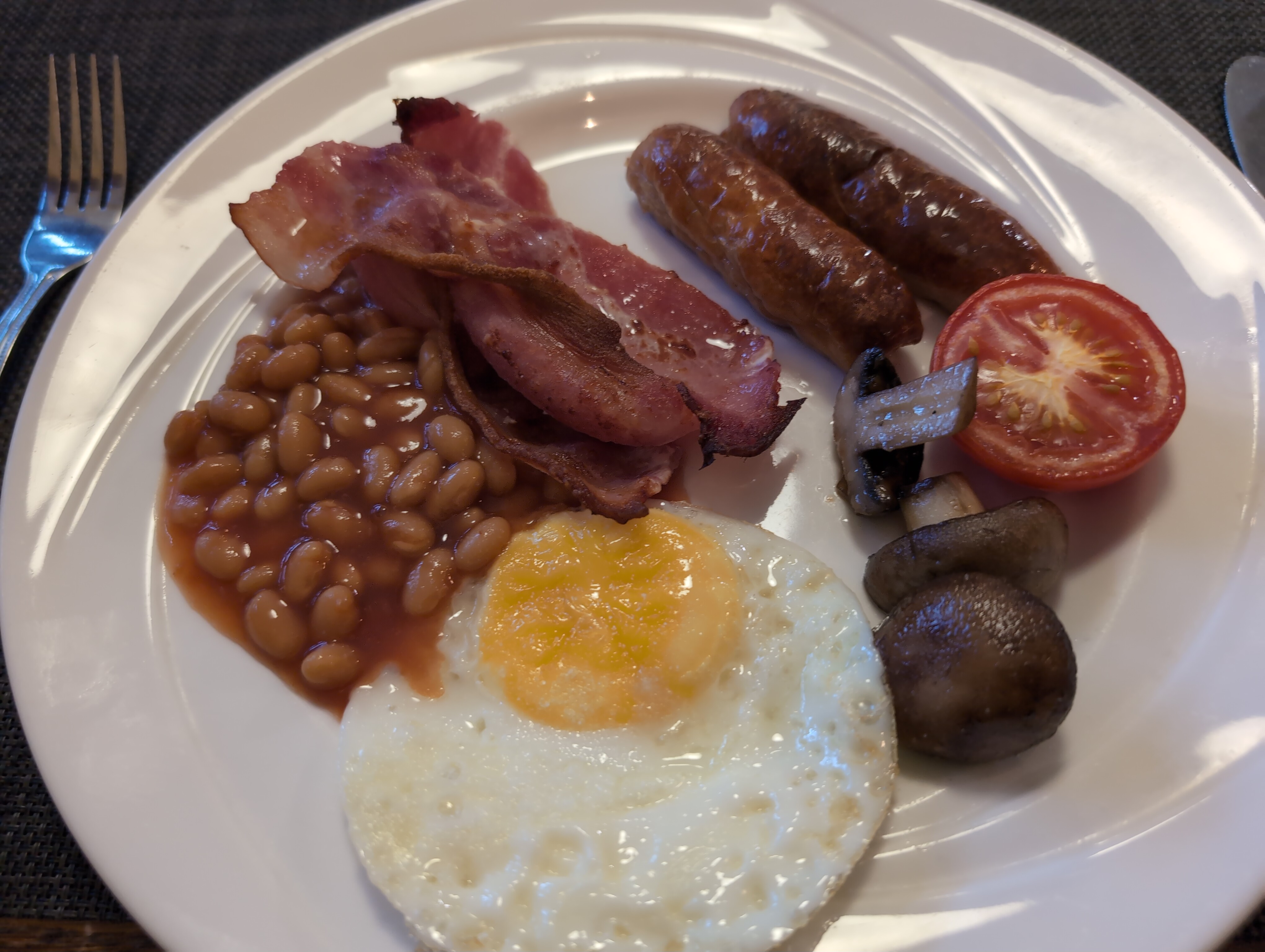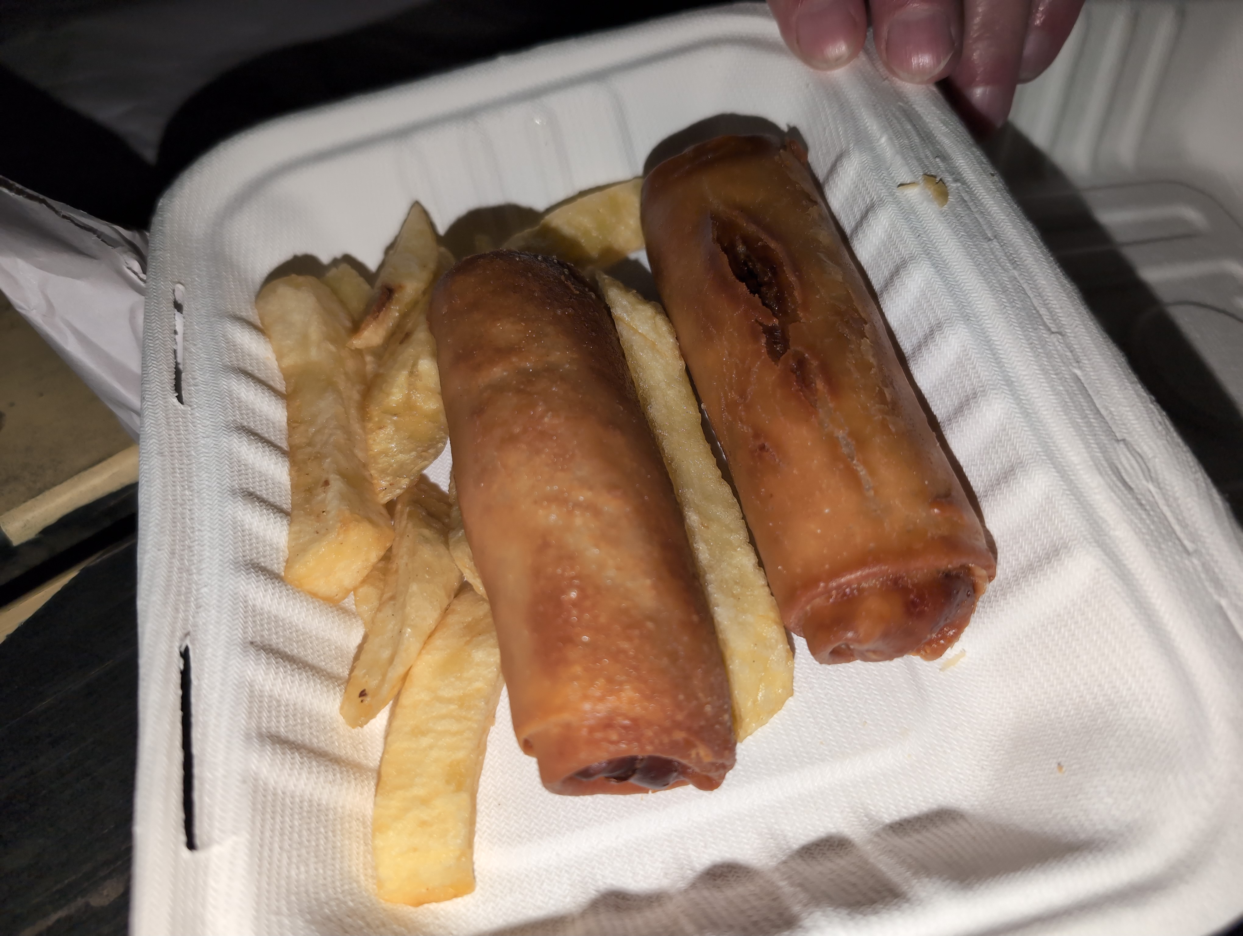 Back to the Fish Bar for late supper: red pudding, spring rolls.