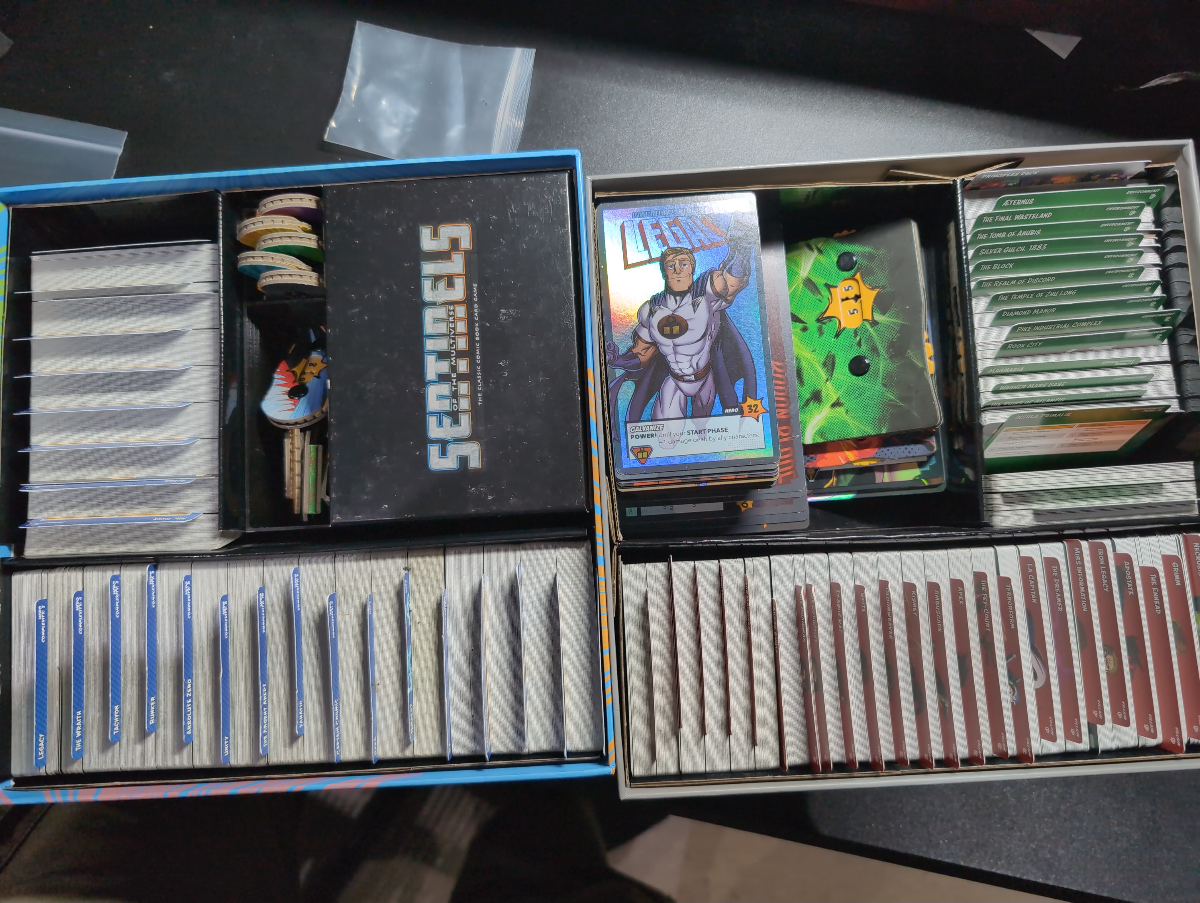 dividers; bottom centre is all the small cards (hero, villain and